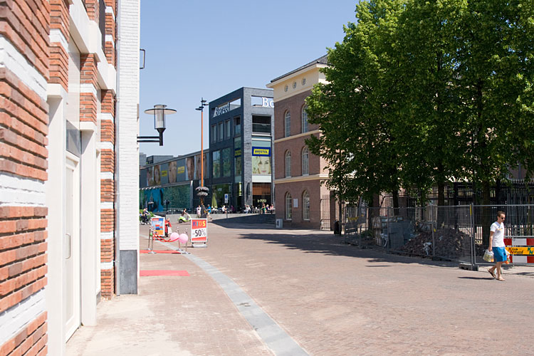 De Houtmarkt werd een autoluwe straat. Op de achtergrond de nieuwbouw op de noordpunt van het terrein.