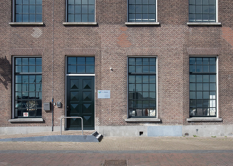 De rechterpoot van de U, oftewel de noordvleugel, is het oudste deel van de kazerne en kende diverse verbouwingen. Rechts naast de deur is aan de afwijkende kleur steen te zien dat hier vroeger een van de toegangspoorten van de kazerne was. |