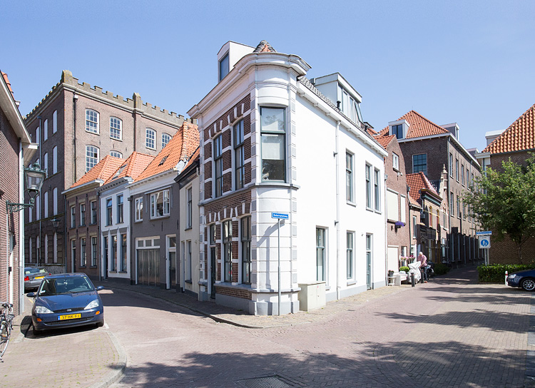 Hoek Botervatsteeg/Buiten Nieuwstraat. Vanuit dit standpunt zijn twee delen van de kazerne te zien. Rechts de zuidvleugel aan de Oudestraat/Botervatsteeg en links het schoolgebouw aan de Buiten Nieuwstraat. De burgerhuizen op de voorgrond zouden, als de kazerne verder was gegroeid, er op den duur deel van hebben uitgemaakt en/of gesloopt voor nieuwbouw. |