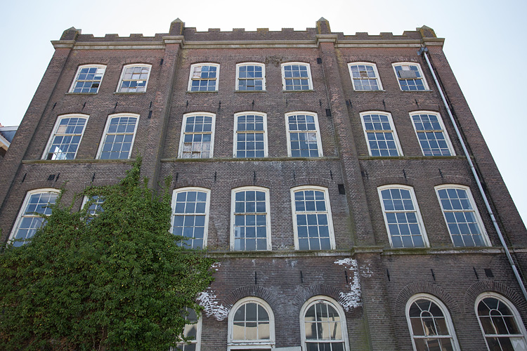 Het schoolgebouw. De kantelen zijn in een andere kleur baksteen uitgevoerd waardoor je kunt vermoeden dat ze een latere toevoeging zijn. Een bouwhistorisch onderzoek rept hier echter niet over.