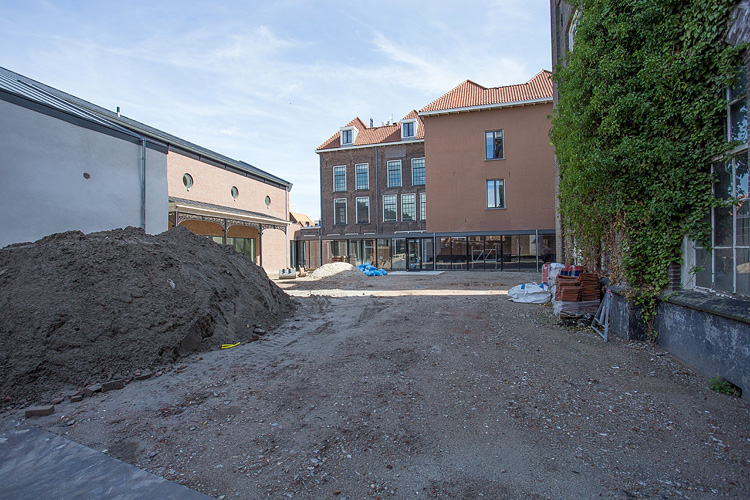 Links de loods van het stadsarchief. De achterzijde van de noordvleugel is gestuct en bruin-oranje gesaust. Links hiervan twee panden die vanaf de Oudestraatkant niet te zien zijn, maar wel deel uitmaken van de kazerne. Waarschijnlijk is de bebouwing die op deze kavels stond (deels) gesloopt, waarna een uniforme buitengevel opgetrokken werd in stijl van de rest van de kazerne. |
