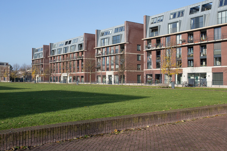 Het voorterrein wordt aan de lange zijden omsloten door twee rijen appartementenblokken, hier in beeld de noordelijke blokken.