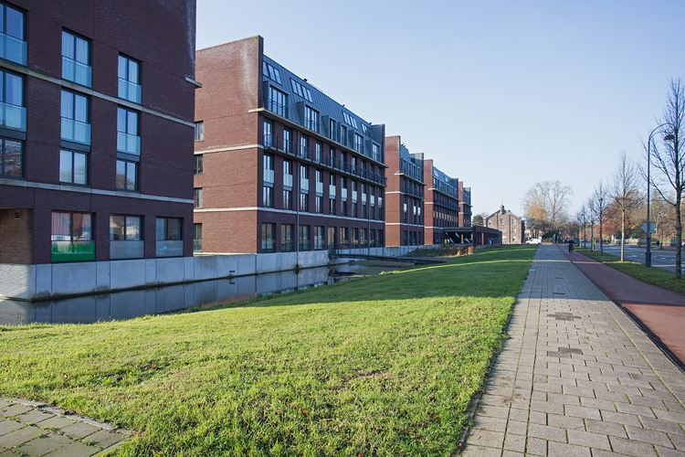 De noordzijde van deze blokken met een gracht die het voormalige kazerneterrein aan vier zijden voor het grootste deel omgeeft. Achteraan op de foto het voormalige gebouw van het kazernecommando waar zich vroeger en nu de toegang voor gemotoriseerd verkeer tot het terrein bevindt. |