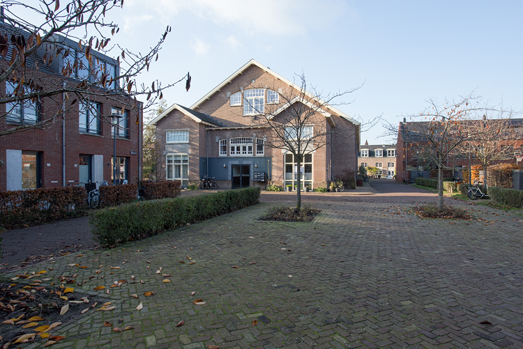 De voorkant van de tweede, nieuwe manege met op de achtergrond de voormalige stallen/garages.