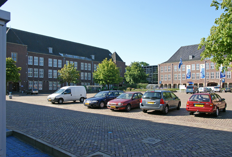 De appèlplaats met links voormalig logiesgebouw A, tegenwoordig lesgebouw. (foto: 27-07-2009)