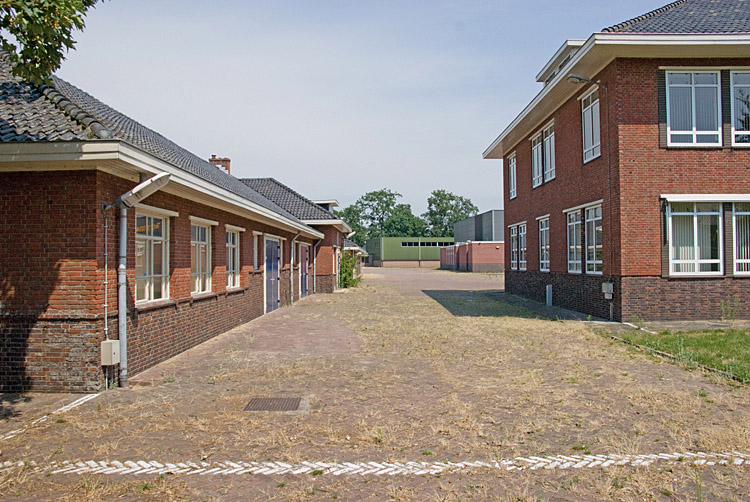 Doorkijk tussen het achterste linker legeringsgebouw en de stallen/magazijn.