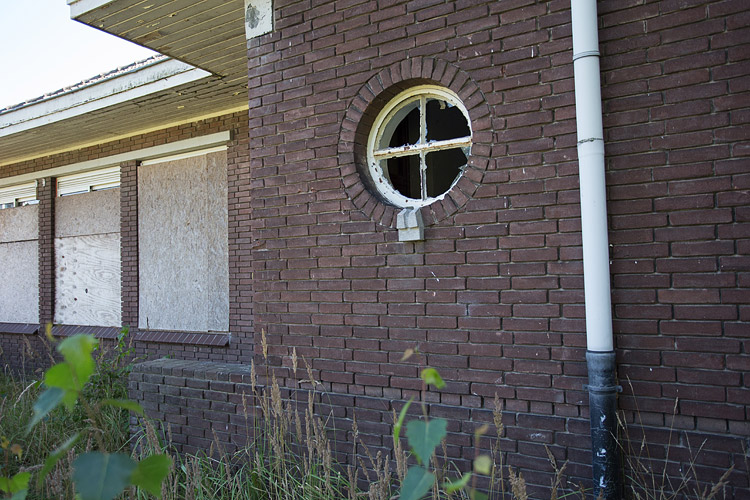 Een soortgelijk raam aan de achterkant van gebouw D. Verder verval in de vorm van afbladderend verfwerk en opschietend groen.