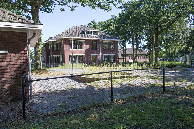 De bureeelzijde van gebouw B. Hier zat jarenlang een kinderdagverblijf, het is sinds eind 2019 onder de naam Adrianohuis in gebruik als woonvoorziening voor mensen met een verstandelijke beperking. Links op de foto het resterende voormalige buitenprivaat. |