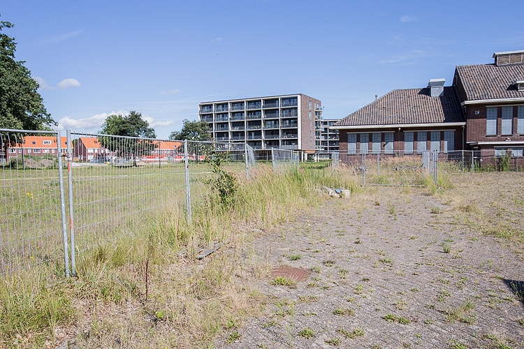 Appartementenblokken aan de westzijde van het kazerneterrein. De strook groen is Cort Heyligerspark genoemd. Ondanks dat men zoveel mogelijk begroeiing wilde sparen, het project heet immers Het Groene Gordijn, zijn er nogal wat bomen gesneuveld om de woningen met de rode daken te kunnen bouwen. De tijdelijke metalen hekken staan er alweer jaren. |