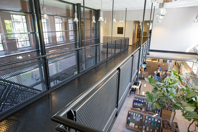 In de ruimte van de apotheek werd de verdiepingsvloer verwijderd. Om toch van de ene kant van de eerste verdieping naar de andere te kunnen, werd er een brug ingelegd die licht hellend is vanwege de hoogteverschillen tussen de verdiepingsvloeren. |