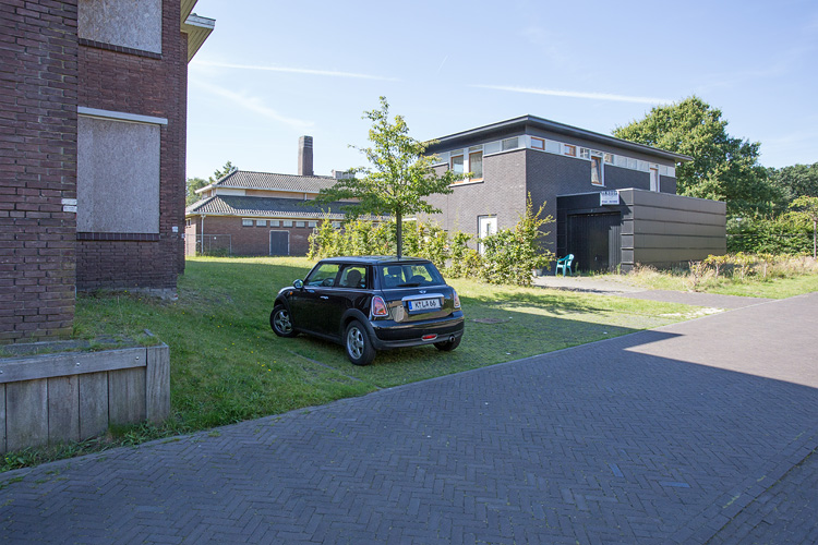 Direct rechts naast de kazerne werden woningen gebouwd. Enkele vrijstaande woningen zoals hier te zien pal naast gebouw C, waarvan hier de kop te zien is en de achterkant van gebouw E.