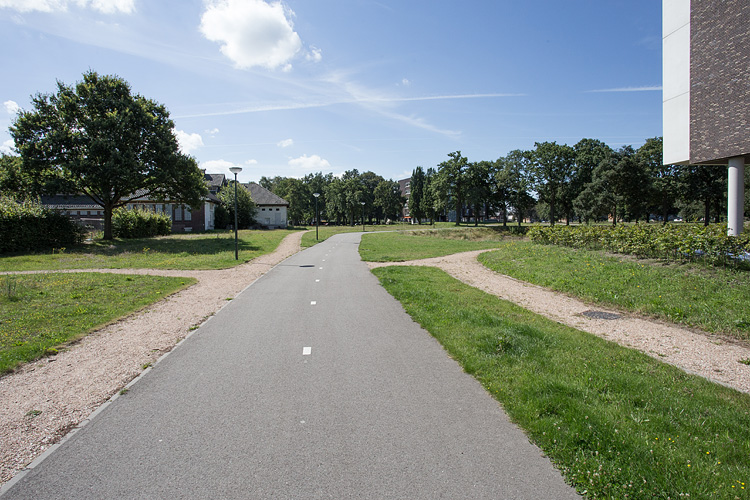 Het Cort Heyligerspark gezien in zuidelijke richting. Links valt de achterzijde van het keukengebouw te zien dat deels wit is geschilderd.