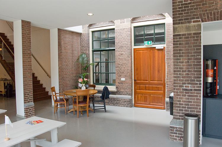 Wat eerst buiten was, is nu binnen. Een deel van de achtergevel vanuit de nieuwe langscorridor. Goed te zien zijn (links) de doorbrekingen in de achtervleugel.
