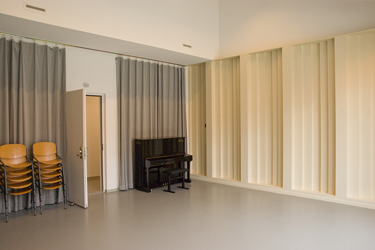 Een van de kleinere oefenzalen in een achtervleugel. Geluiddempende wanden en gordijnen beperken de uittreding van geluid. De vloer draagt hier ook aan bij. Achter de open deur de middengang.