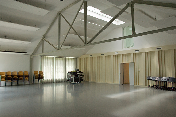 Op de kop van de twee achtervleugels die in gebruik zijn bij Akoesticum zijn grote oefenruimtes gerealiseerd.. Het stalen spant is een noodzakelijke toevoeging voor de overspanning en is in de geest van de stalen spanten in de middenloods. |