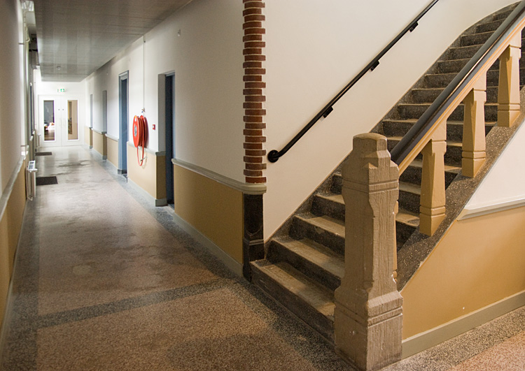 De oude langsgang op de begane grond toont het herstel naar de toestand van 1906. In later jaren (na WOII) waren de gangen van wandtegels voorzien, de trappen van vinylbekleding en was het algemene kleurenschema: wit (tegelwerk) en rood (schilderwerk en siertegelranden). |