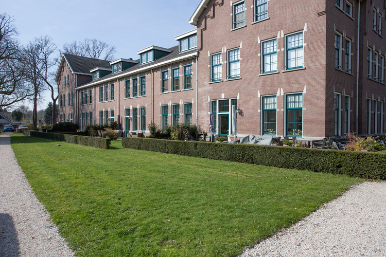 Voorzijde linker legeringsgebouw. Per appartement op de begane grond is een van de vensters veranderd in een deuropening. Dit is zodanig gedaan dat het nauwelijks opvalt, ook de lage heggen die de tuintjes afscheiden storen niet. |