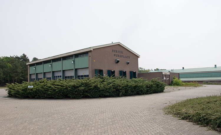 Eén van de herstelwerkplaatsen aan de linkerkant van de hoofdweg.