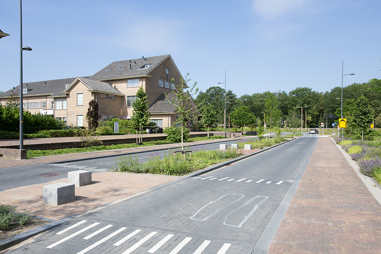 Terugblik over de Piet Romboutlaan naar de Generaal Hackettlaan met links het eerste legeringgebouw, nr. 70.