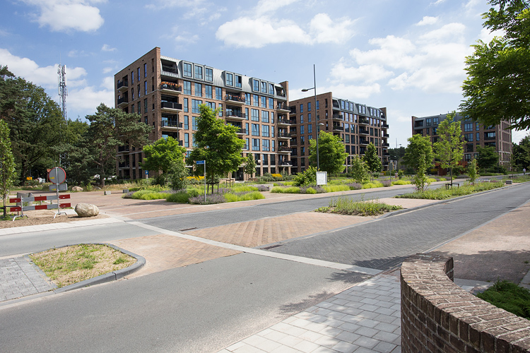 Blik over de Piet Romboutlaan naar de drie appartementenblokken die Simon Stevin I, II en III genoemd zijn. De ruimte ervoor is enigszins vrijgehouden als herinnering aan het exercitieterrein dat hier lag. Het linkergebouw staat ongeveer op de plaats van de kantine. |