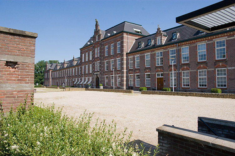 Ook onder het voorterrein van de Snijderskazerne ligt een parkeergarage, de trap rechtsvoor op de foto leidt daar naartoe. Hier eindigt ook het monumentale hekwerk, dat zonder verdere afwerking verwijderd is. |