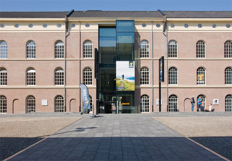 Een van de (geringe) aantastingen van de gevel. Er zijn op diverse plaatsen glazen uitbouwen gemaakt en deze loopt tot onder de dakrand. Hier is ook te zien dat het plein, dat tevens het dak van de parkeergarage is, hoger ligt dan de begane grond van het hoofdgebouw. |