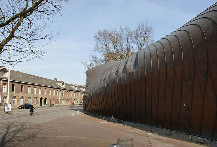 Poppodium Mezz, de met koper beklede zaal die tegen de officiersmess aangebouwd is. Links op de achtergrond zijn de voormalige Lange Stallen uit 1764. Ze waren als Stallenkazerne in gebruik bij de veldartillerie en tot ver na de 2e Wereldoorlog gebruikt door ondermeer 414 Intendancebataljon en de ABC school. Sinds 1981 zijn hier winkels, kantoren en woningen gevestigd. |