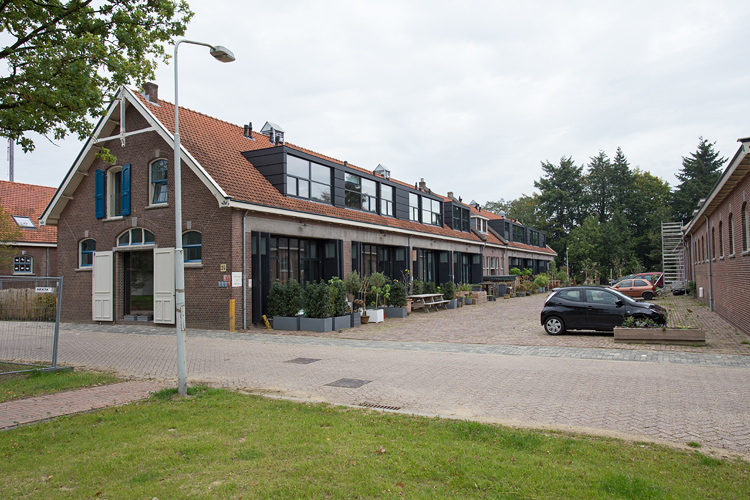 Een van de voormalige stallen die werd omgebouwd naar woningen. Hoewel deze stallen geen monumentstatus hebben, wordt wel strak de hand gehouden aan het nieuwe kleurenschema.