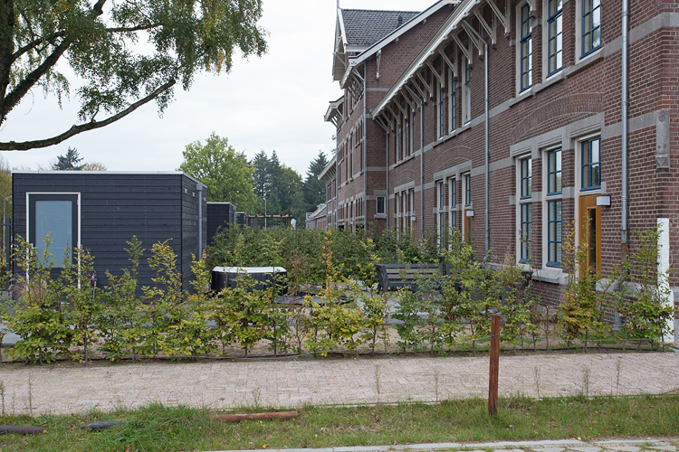 Een concessie die bij geen enkele herbestemde kazerne gelukkig uitpakt, maar noodzakelijk is voor de leefbaarheid: tuintjes, heggen en schuren die een deel van het zicht op de begane grond van het gebouw wegnemen. |