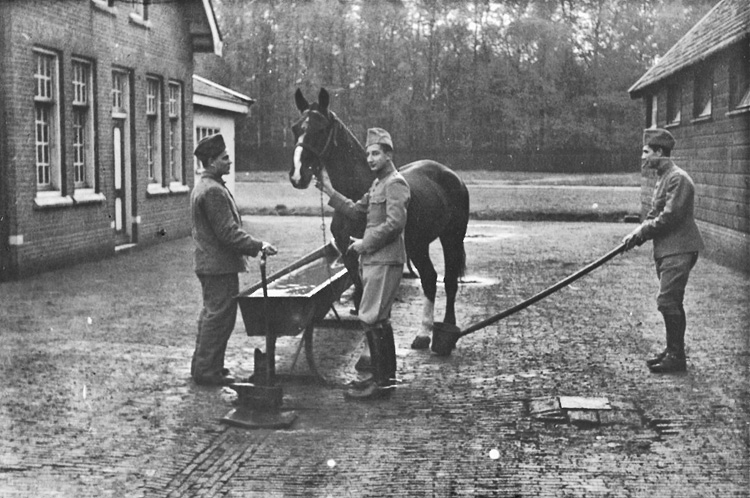 Kornet De Vlaming met paard aan het halster in de ruimte tussen smidse en de stal van de SROBA.