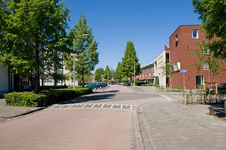 Met de ingang aan de Bredaseweg in de rug, doorkijk naar de andere ingang aan de Korenbloemstraat. Deze straat heet de Henriƫtte Ronnerstraat en volgt min of meer de belangrijkste weg van de kazerne. Op de plaats van de huizen aan de rechterkant waren de tot garages omgebouwde stallen, links waren er een langgerekte loods en parkeerplaatsen (toestand kort voor de sluiting). |