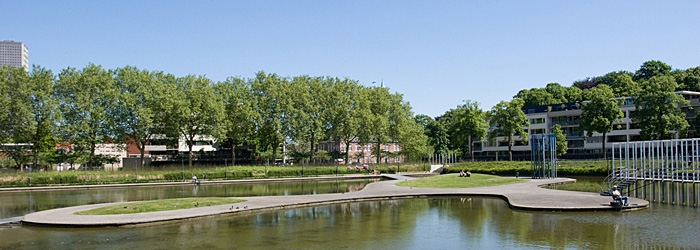 Op de plaats van het grasveld is een vijver gegraven waarvan speelse elementen een onderdeel vormen. Samen met de boomsingels vormt de vijver het Kromhoutpark.