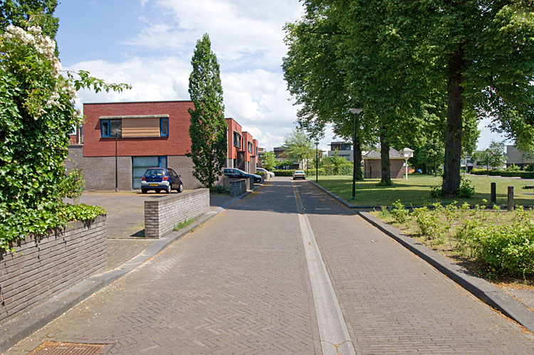Foto genomen met het hoofdgebouw linksachter. Op de plaats van de voorste woning met rode bovenverdieping stond het legeringsgebouw, verder naar achteren de stallen/binnenmanege die later sport/toneelzaal werd. |