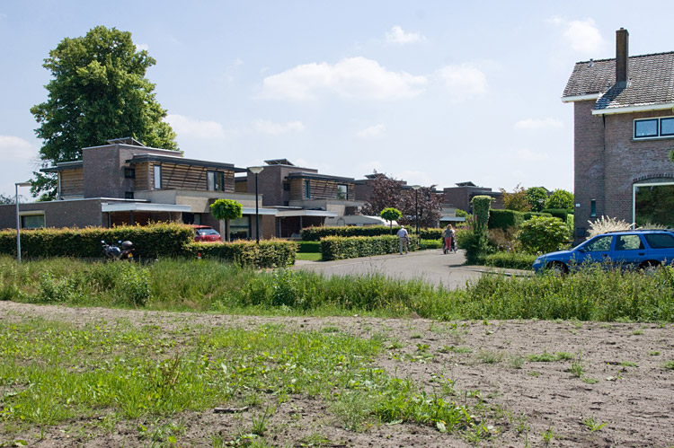 De plaats van de achteringang, de woning rechts is een voormalige dienstwoning. Er is een stille getuige van de kazerne blijven staan. Rechts van de vrouw op de foto die een rolstoel duwt is een merkwaardige tapstoelopende en afgeplatte boom te zien. Dit is de overwoekerde rechterkolom van het poorthek. Het wachtgebouwtje stond op de plaats van de inrit van de eerste woning links. |