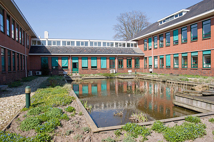 Vijver tussen het hoofdgebouw en de latere uitbreiding.
