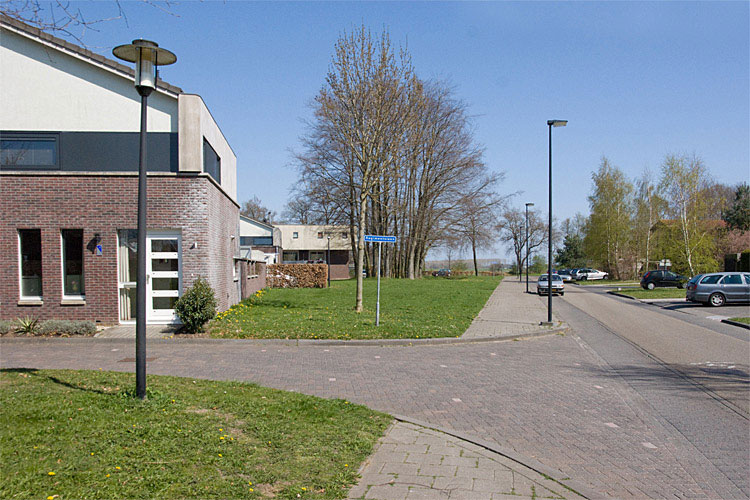 Het straatnaambordje vermeldt : Regimentslaan. Op de plaats van de woning links stond het rechter legeringsgebouw uit 1939. Links van die bomen verderop stond de keuken/eetzaal. |