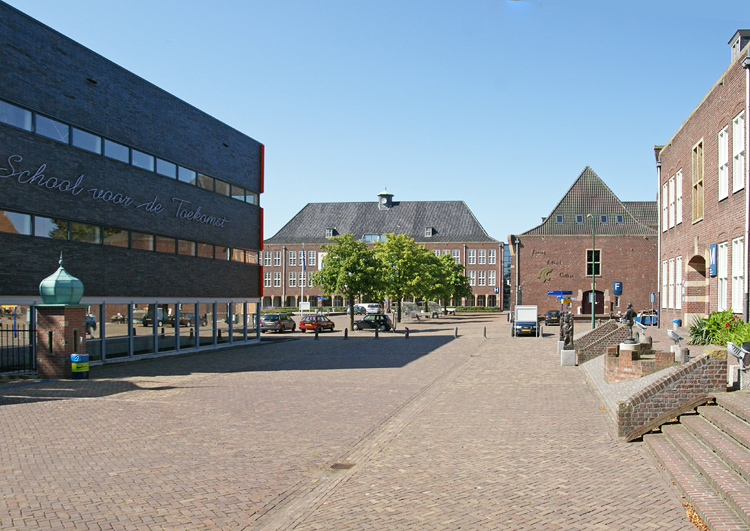 Links de nieuwbouw van De School voor de Toekomst, verder naar achteren het voormalige logiesgebouw B, meer naar rechts de kop van logiesgebouw B1. (foto: 02 -04-2009)