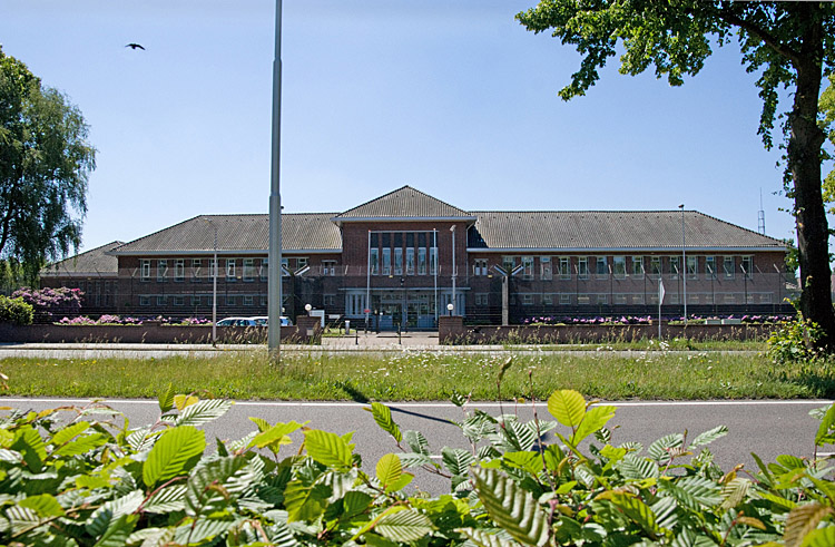 De hoofdingang van de PI Tilburg is omgeven door een indrukwekkende reeks hekken met prikkeldraad bovenop.